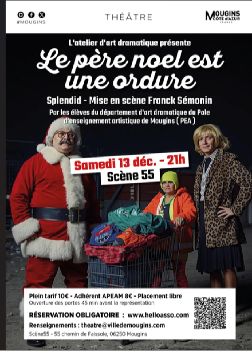 Avis aux amateurs de fous rires ! Le samedi 13 décembre 2025, la Scène 55 de Mougins accueille l’un des plus grands classiques du théâtre comique français : Le Père Noël est une ordure.Une nuit de Noël pas comme les autres… Dans les bureaux de l’association “SOS Détresse Amitié”, la permanence tourne vite au cauchemar : appels loufoques, visiteurs imprévus, un Père Noël dépressif, et des situations totalement absurdes !Entre répliques cultes, humour grinçant et rythme effréné, cette pièce devenue mythique promet une soirée pleine d’éclats de rire.Alors, oubliez les cadeaux et le sapin le temps d’une soirée, et venez (re)découvrir cette comédie délirante qui n’a pas pris une ride ! Rendez-vous à Mougins, le 13 décembre, pour une dose d’humour à partager sans modération