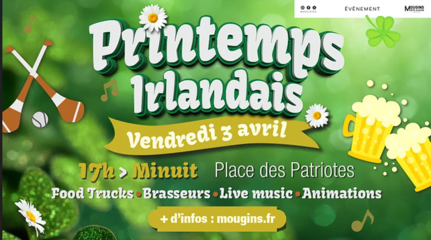 Ambiance verte et festive à Mougins !Le vendredi 3 avril 2026, la Place des Patriotes accueille le Printemps irlandais, un rendez-vous convivial inspiré de l’esprit de la Saint-Patrick.