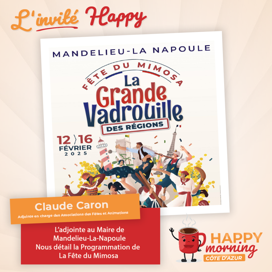 Dans l'émission happy morning Côte d'Azur, Loric reçoit Claude Caron adjointe au Maire de Mandelieu en Charge de la Fête du Mimosa. Présentation et questions / réponses sont au programme de cet interview.