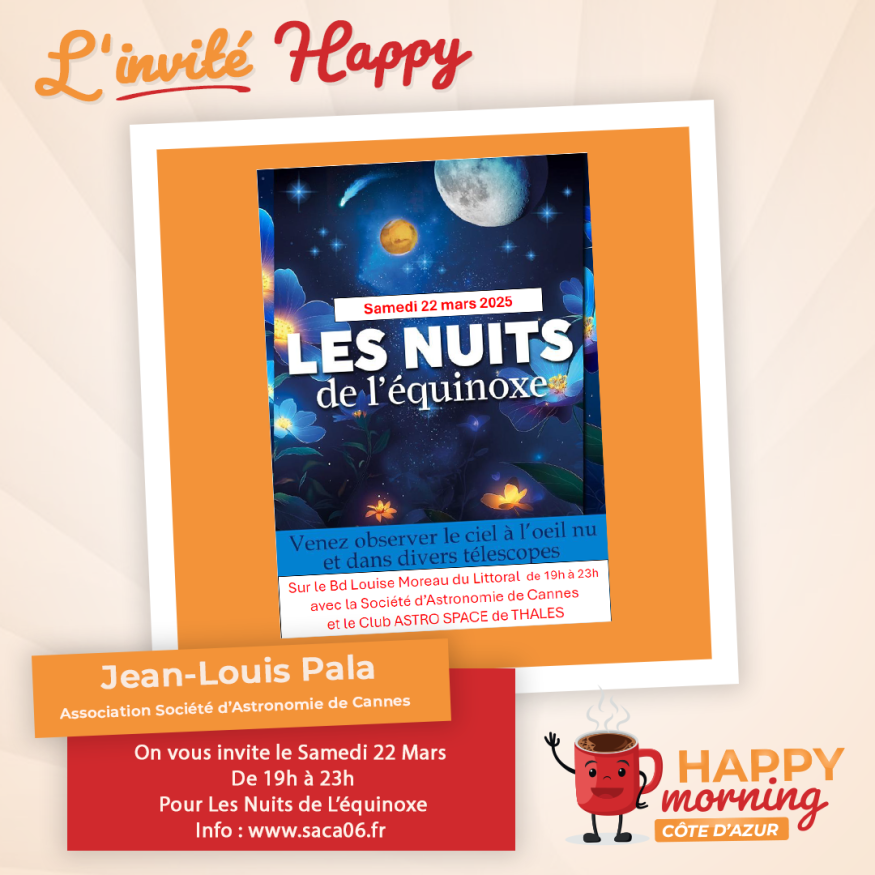 Dans l'émission happy morning Côte d'Azur, Loric reçoit Jean-Louis Pala "Les nuits de L'équinoxe". Présentation et questions / réponses sont au programme de cet interview.