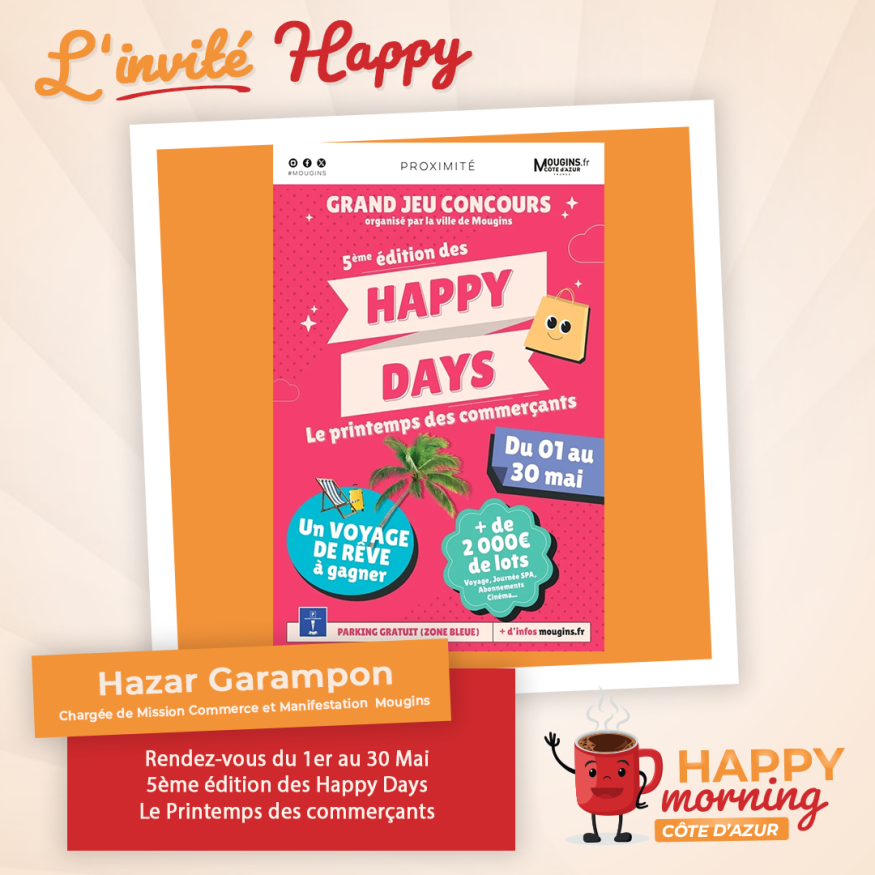 Dans l'émission happy morning Côte d'Azur, Loric reçoit Hazar Garampon Chargée de Commerce et Manifestation équipe d'organisation de la 5ème édition des Happy Days de Mougins. Présentation et questions / réponses sont au programme de cet interview.