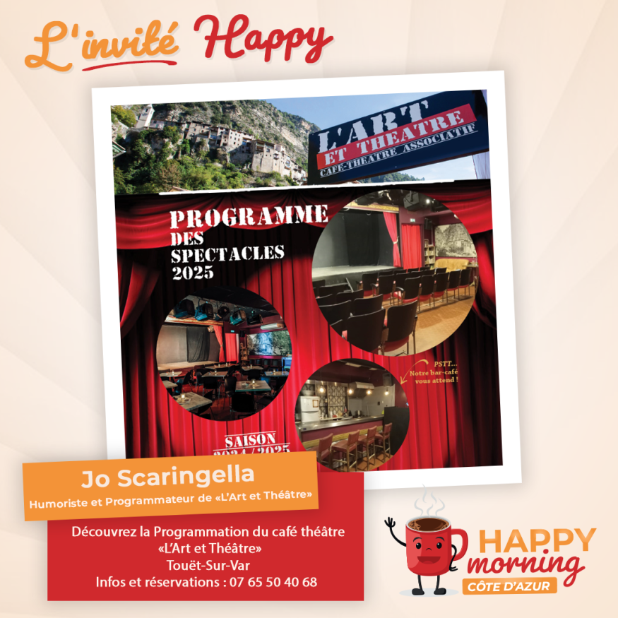 Dans l'émission happy morning Côte d'Azur, Loric reçoit l'humoriste Jo Scaringella en charge de la programmation de l'Art Théâtre à Touët sur Var. Présentation et questions / réponses sont au programme de cet interview.