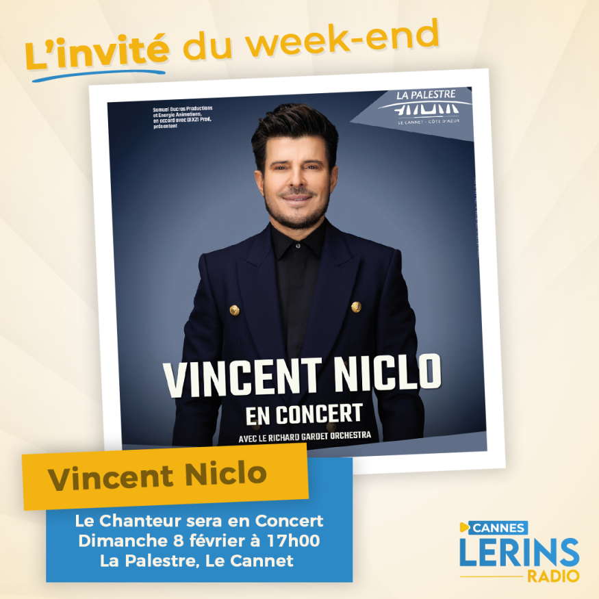 Dans l'émission l'invité de la semaine, Loric reçoit le Chanteur Vincent Niclo qui nous parle de sa carrière et de son concert le dimanche 8 février à 17h00 à la Palestre le Cannet entouré et accompagné par l'Orchestre de Richard Gardet, une Voix à ne pas manquer. Présentation et questions / réponses sont au programme de cet interview.