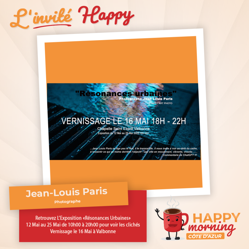 Dans l'émission happy morning Côte d'Azur, Loric reçoit Exposition Valbonne jusqu'au 25 Mai. Présentation et questions / réponses sont au programme de cet interview.